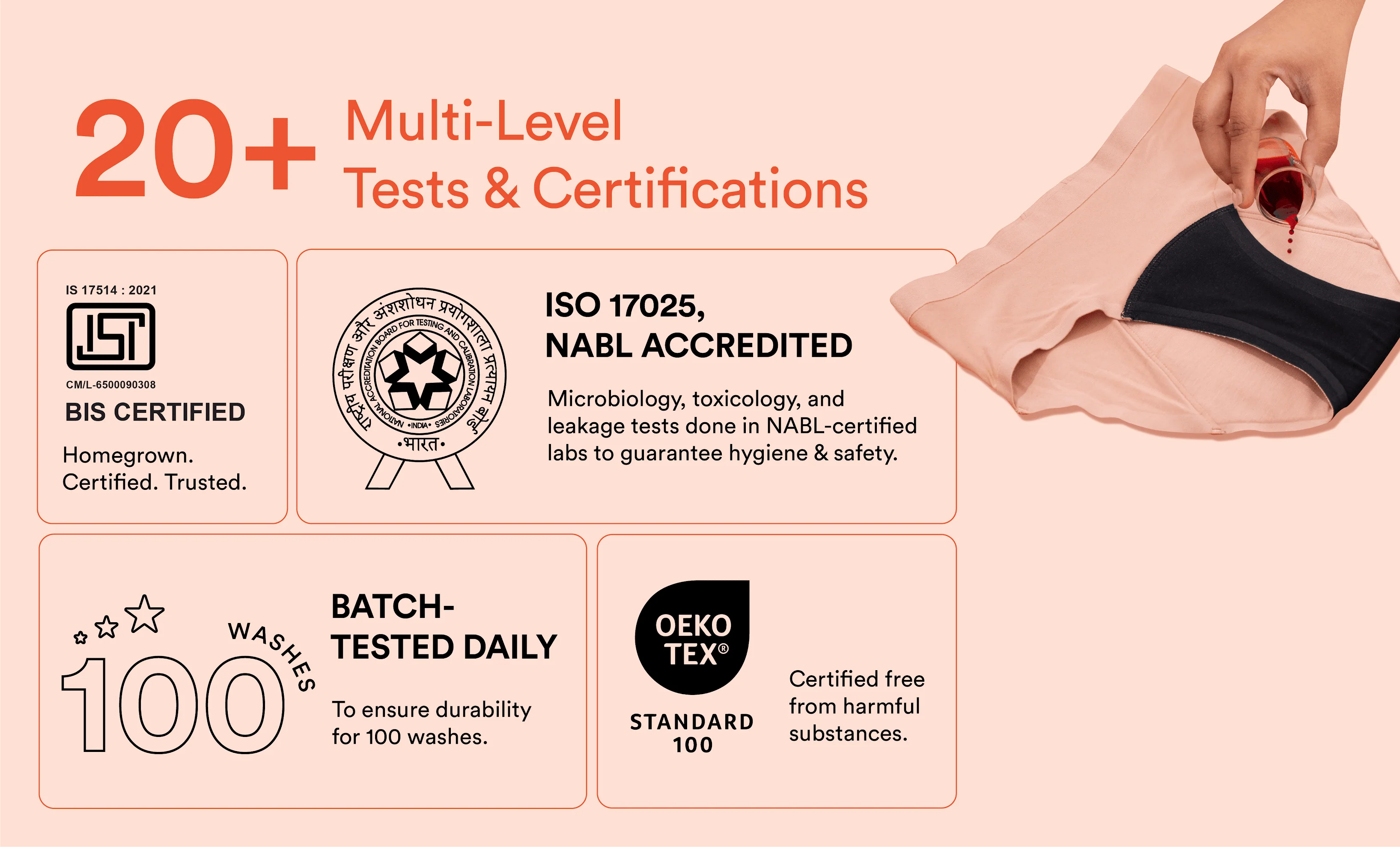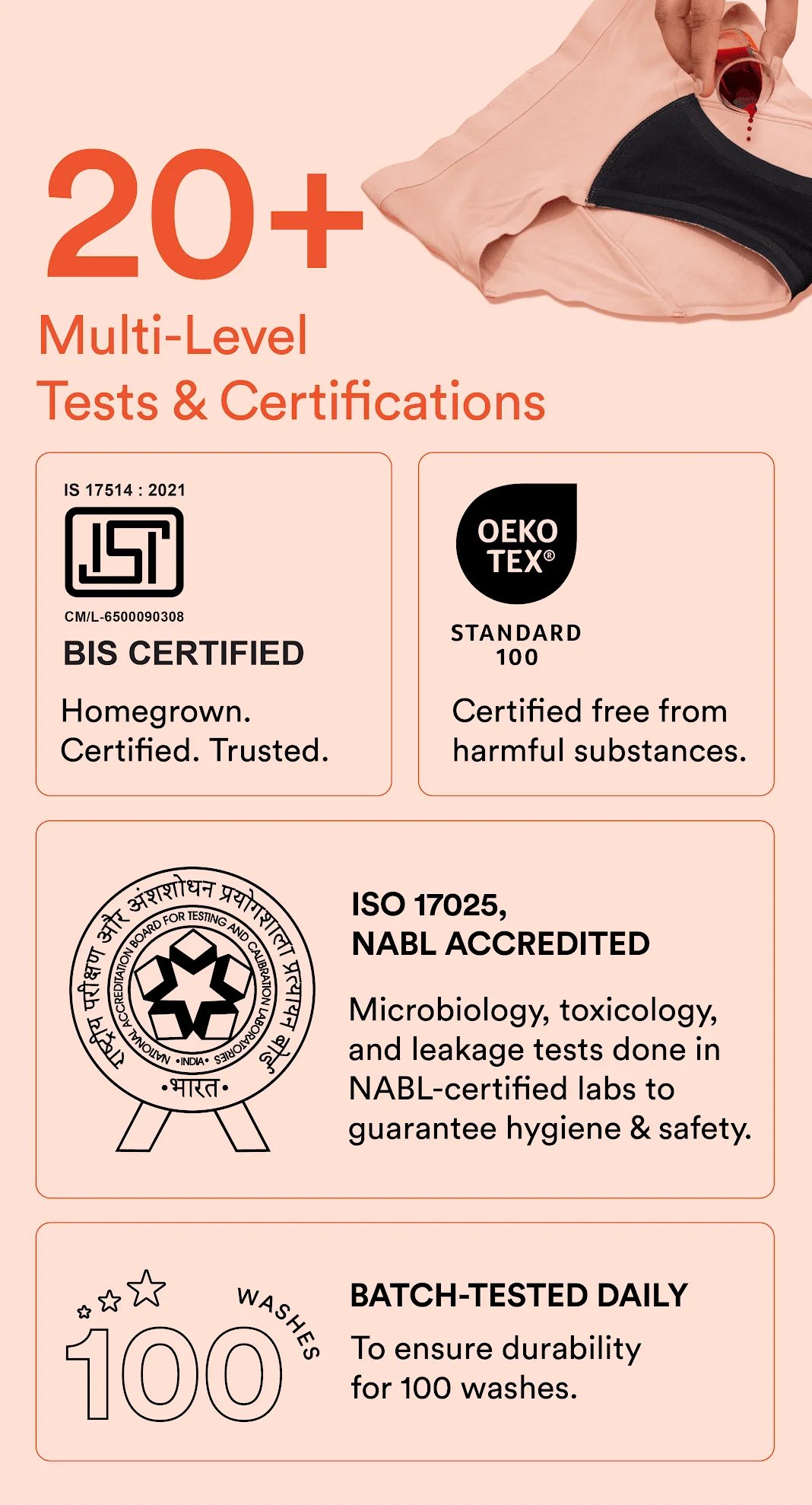 As India's First Bonded Period Panty, our product is engineered with advanced apparel technology, like our highly absorbent 3-layer gusset, and bonding technology to ensure you don't leak for up to 12 long hours. Stay worry and stain free with our front-to-back extended coverage.