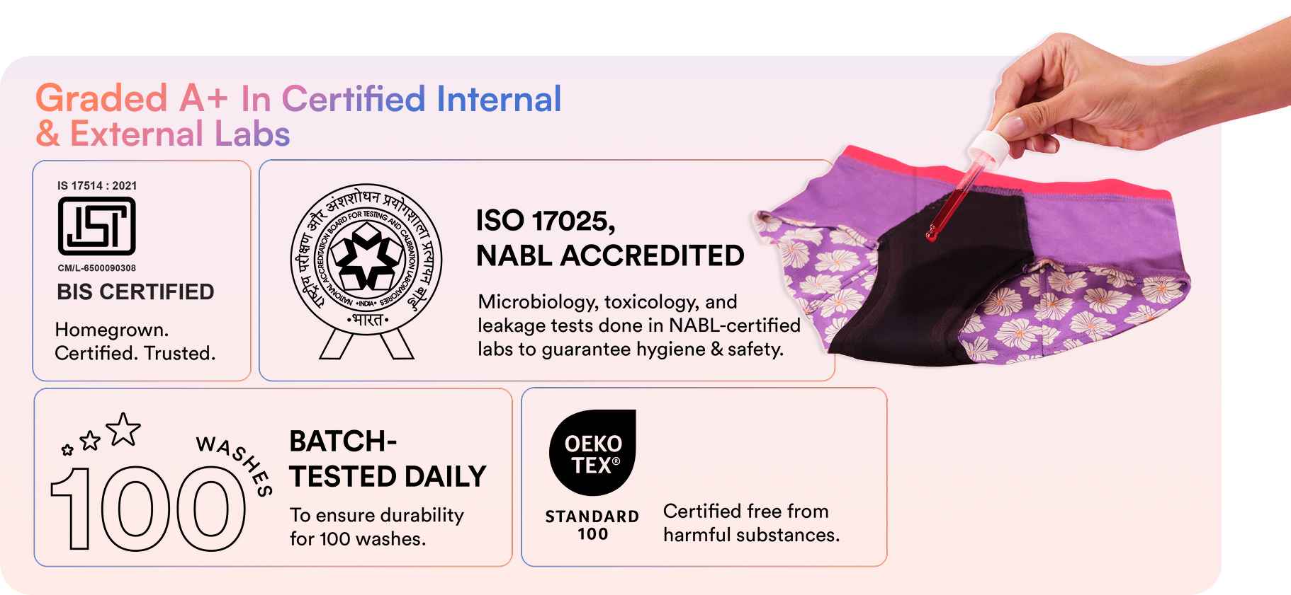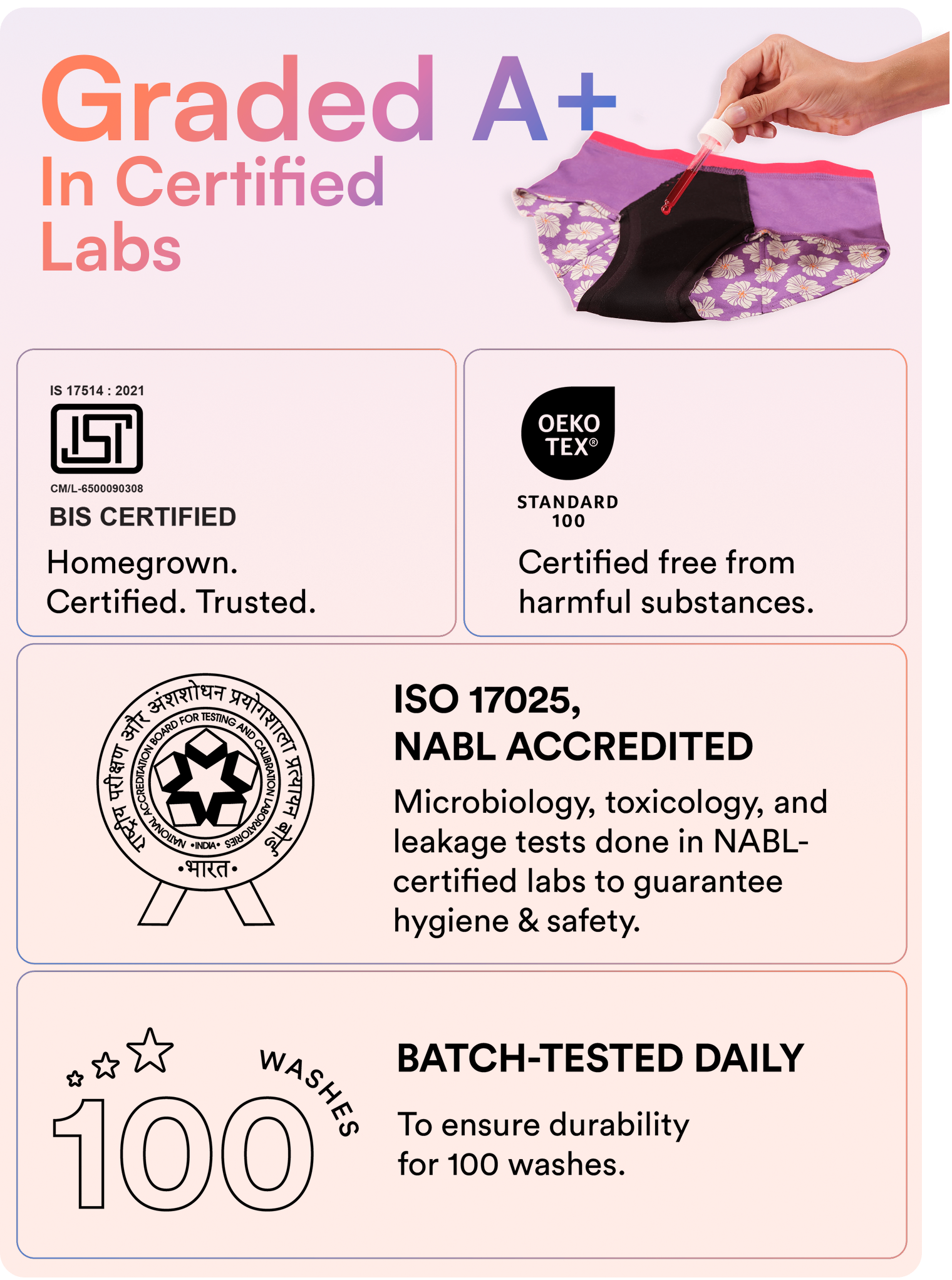 Yes. Our period underwear for girls is verified in NABL certified labs for safety and performance. Every teenager absorbent panty passes over 20 checks for absorbency, toxins, and durability, so you get period comfort backed by science.